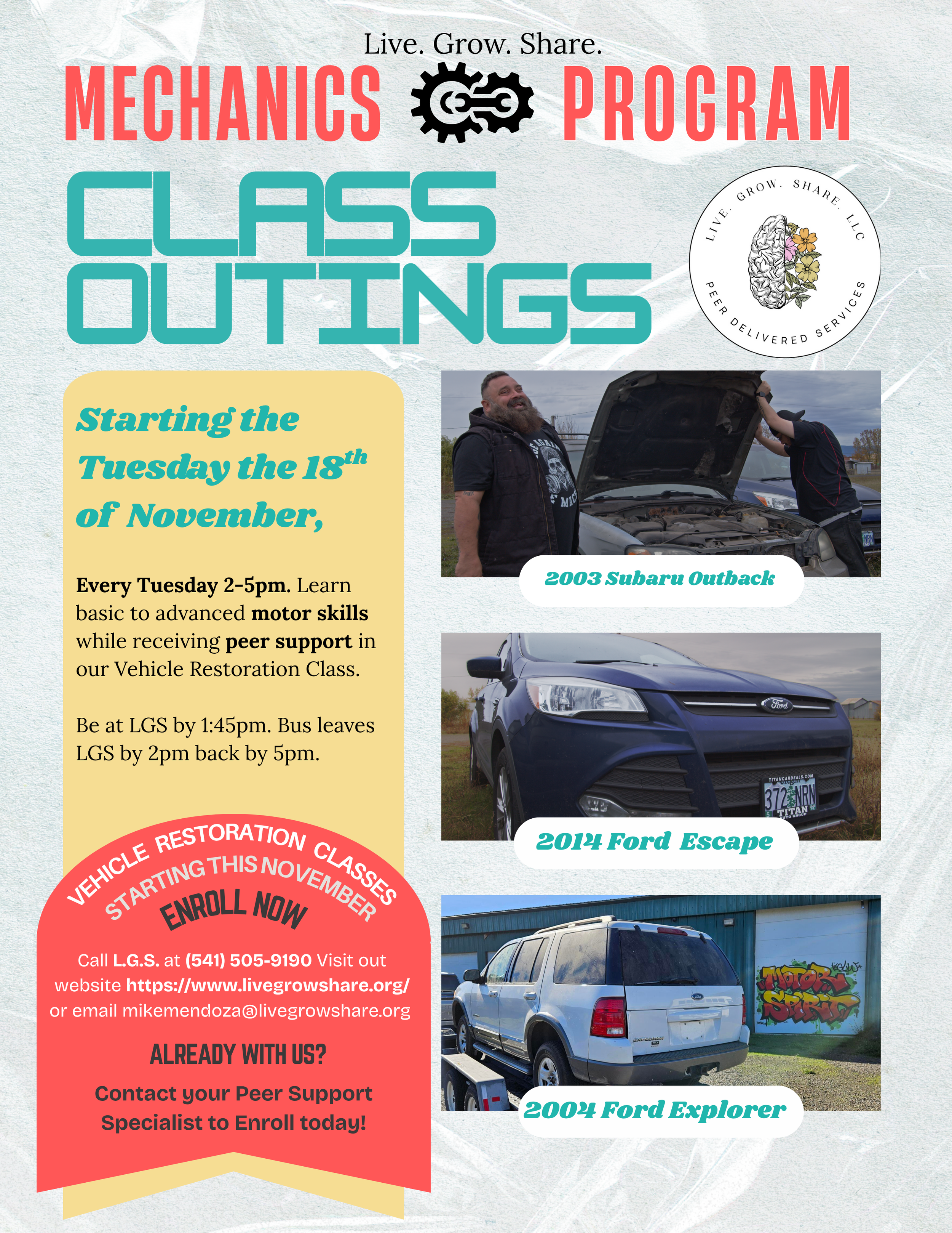 The Mechanics & Vehicle Restoration Program at Live.Grow.Share. offers participants an opportunity to a hands-on approach to learning the dynamics of vehicle repair. Working alongside our Certified Master Mechanic, this program provides therapeutic services while engaging in an educational environment. From oil changes, tire rotations, and small repairs to mechanics adventures and field trips, we give our participants a unique way to learn and grow.